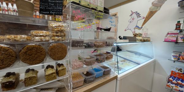 Cakes, cookies, hot waffles, ice creams, sweets, paninis, cheesy chips, hot and cold drinks and more! Delicious!